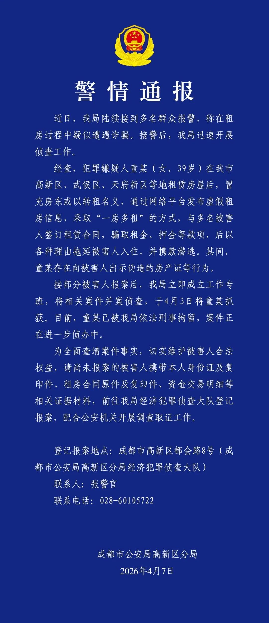 成皆市公安局高新区别局发布警情通报: