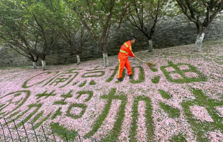 就像前几天,激勉热议的苏超嘉宾除了何润东,还有刘金顶,他是南京玄武湖边的一位管养员。在惩处落花时,他用扫帚画出了为南京队、为苏超加油的图案。