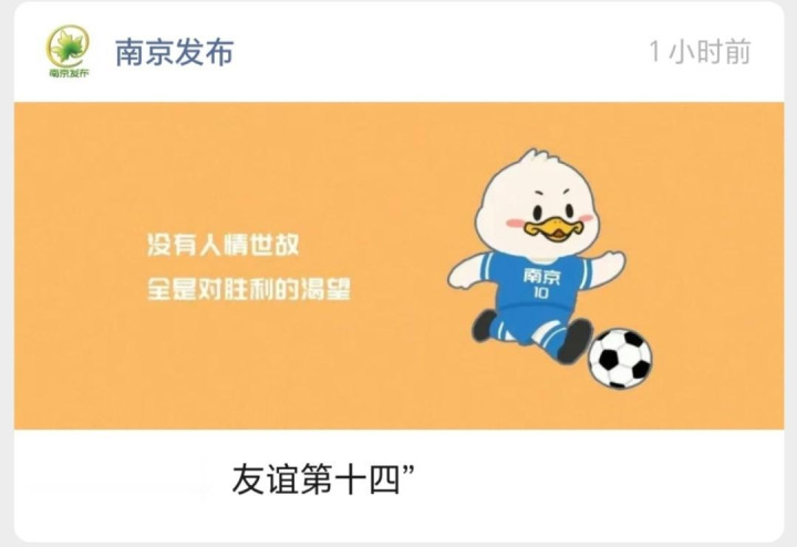客岁的“比赛第一,友谊第十四”标语十分出圈。(图/南京发布)
