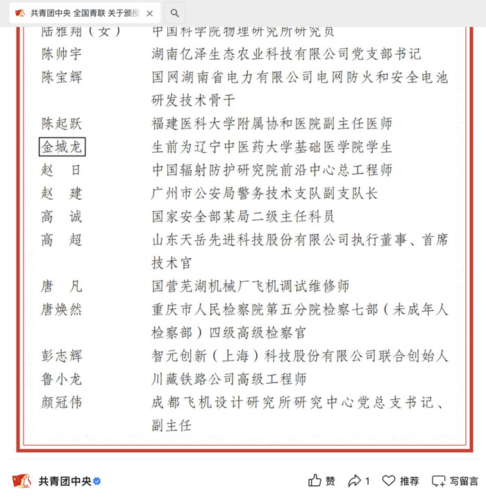 北京日报记者预防到,辽宁中医药大学基础医学院学生金城龙获2026年中国后生五四奖章,但他的名字被加上了黑框。