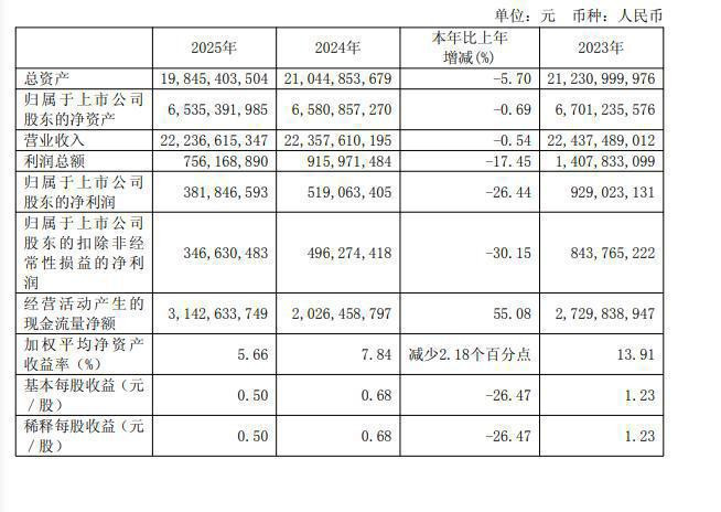 事迹方面,2025年利润总和下降17.45%,包摄于上市公司推动的净利润下降26.44%,包摄于上市公司推动的扣除异常常性损益的净利润下降30.15%,基本每股收益下降26.47%。