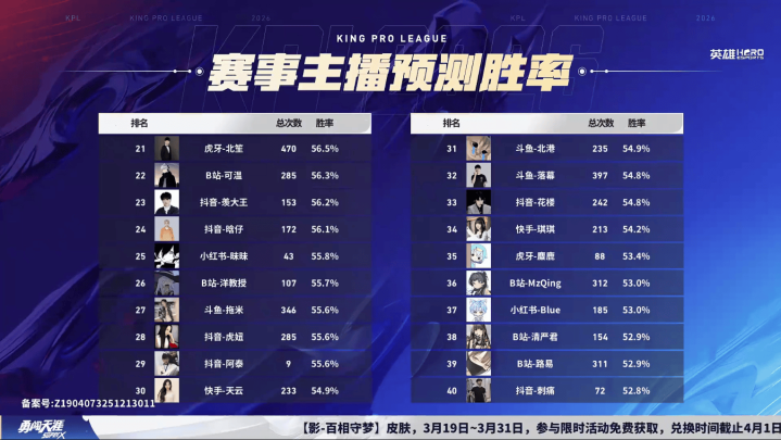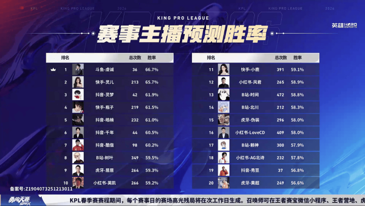 斗鱼-虔敬胜率66.7%,位于排名榜第一。