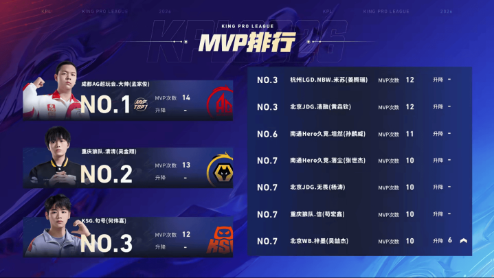 KSG句号(何伟嘉)、LGDNBW-米苏(姜腾瑞)、JDG清融v(黄垚钦)累计得回12次MVP,并排第三;