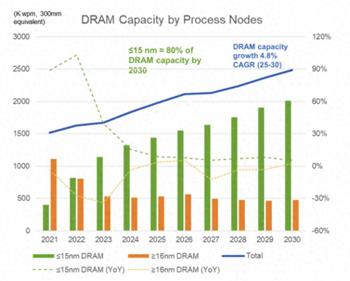 据闪德资讯获悉,SEMI行家产业筹谋总监Clack Cheng在SEMICON Korea 2026会议上默示,2025-2030年技能,行家DRAM产能年均增速将督察在4.8%傍边。