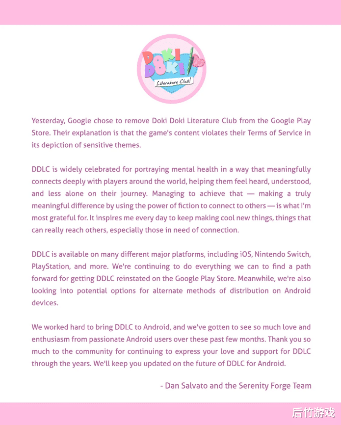 《心跳体裁部》最近因“触及敏锐主题”,违背处事条件而被谷歌诓骗商店下架。