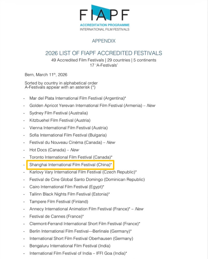 海外电影制片东说念主协汇注首会(FIAPF)近日负责公布首批全新“A类电影节”名单,上海海外电影节凭借近两年的概括推崇、优异数据和越来越卓绝的海外影响力胜仗入选,络续蝉联更具含金量的“中国独一A类电影节”。据悉,这是FIAPF对电影节认证经由履行自2007年以来的最大改良,改良后的认证体系接收了一种前瞻性、聚焦影响力的枢纽。最新公布的获官方“A类”认证的电影节,除上海海外电影节外,还有戛纳、柏林、威尼斯等“老牌”电影节,合计17个。